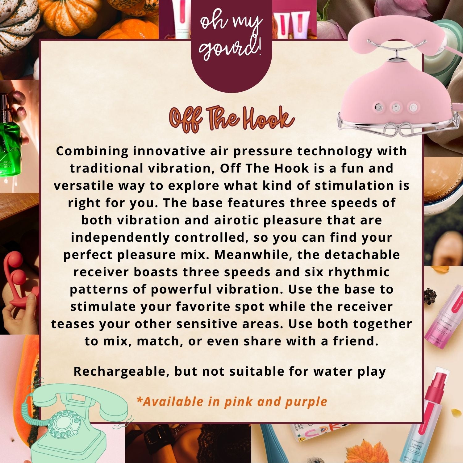 Combining innovative air pressure technology with traditional vibration, Off The Hook is a fun and versatile way to explore what kind of stimulation is right for you.