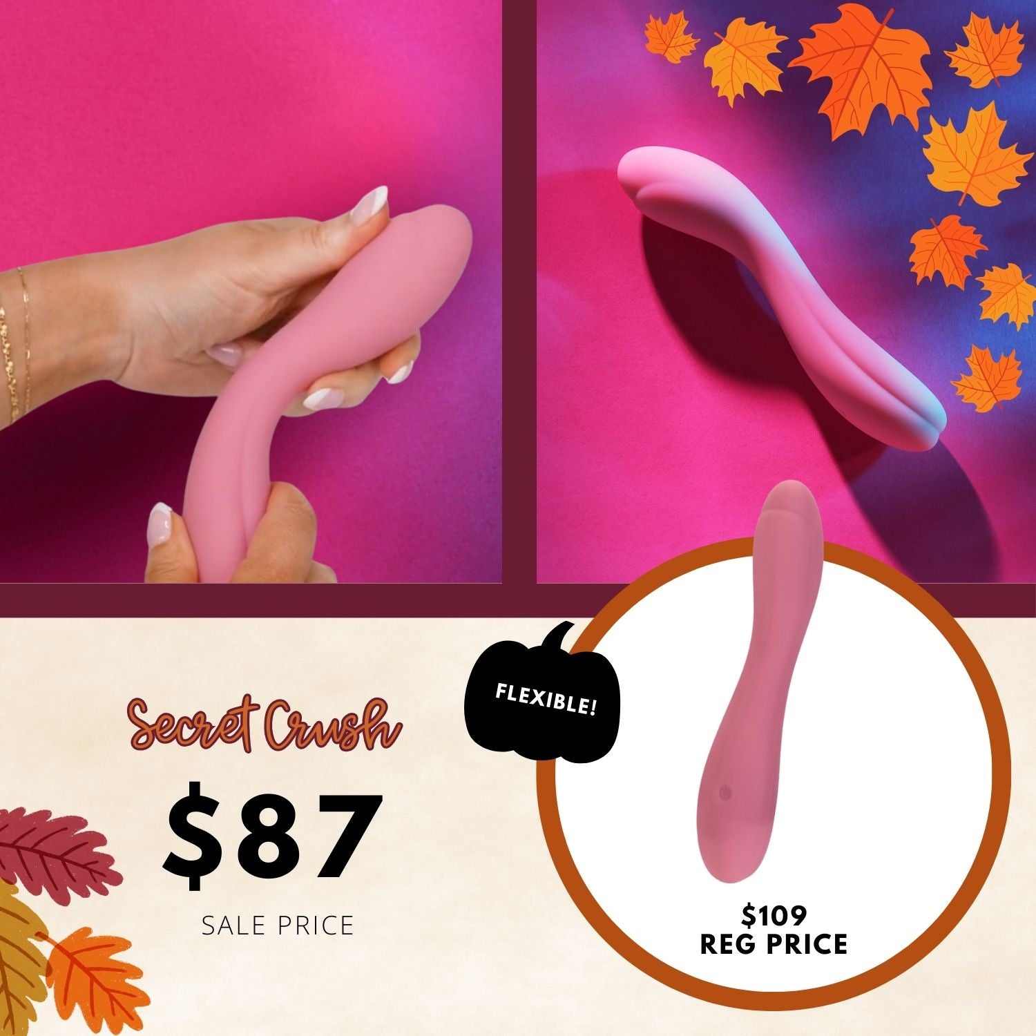 This silky-smooth vaginal vibrator is irresistible to the touch and features a Full Silicone design, making it ultra flexible. Secret Crush's gentle curves make it ideal for G-spot stimulation while its three speeds and five rhythmic patterns of powerful vibration will leave a lasting impression that will have this vibe living in your mind rent free for days.