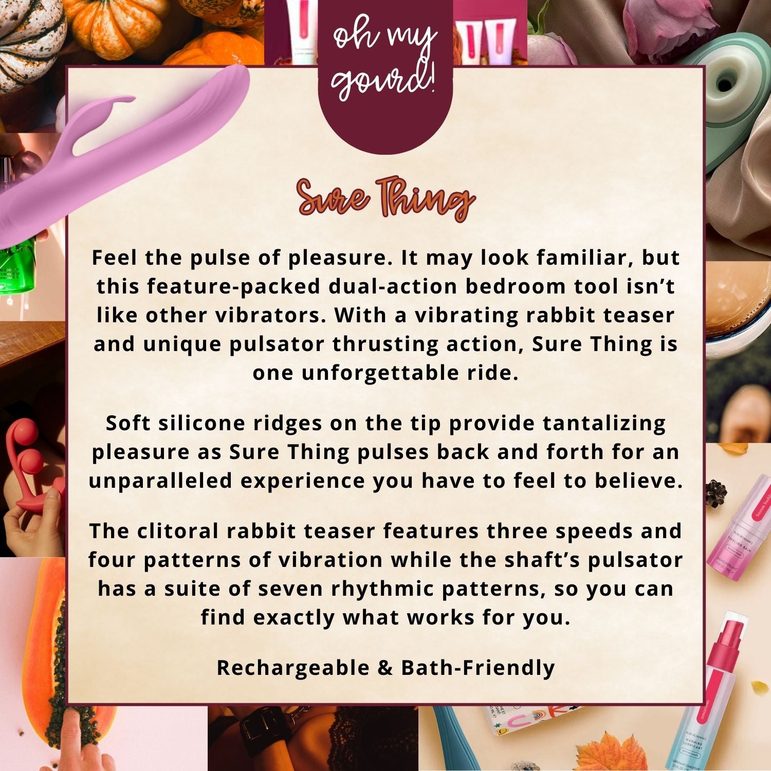 Feel the pulse of pleasure... It may look familiar, but this feature-packed dual-action bedroom tool isn’t like other vibrators. With a vibrating rabbit teaser and unique pulsator thrusting action, Sure Thing is one unforgettable ride.