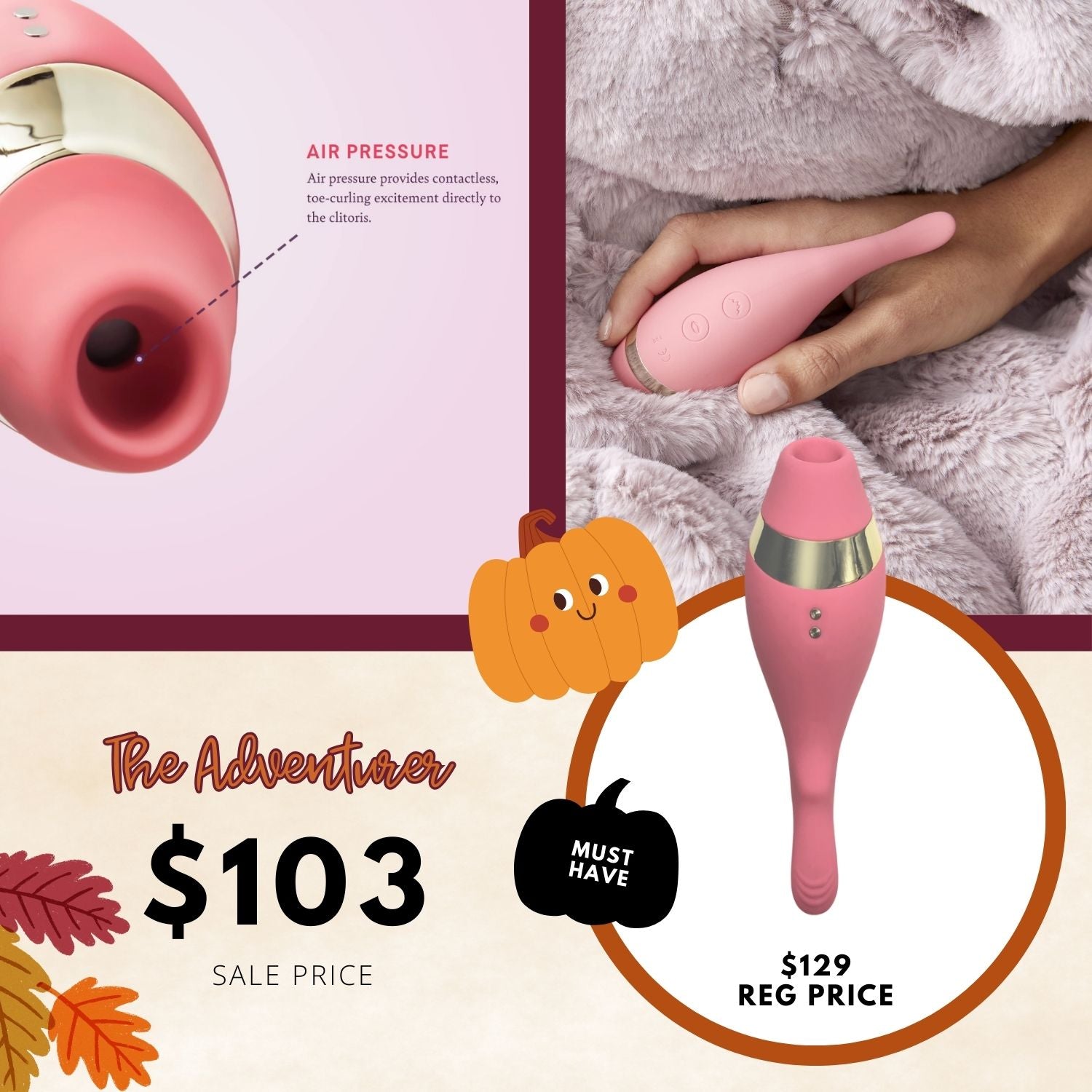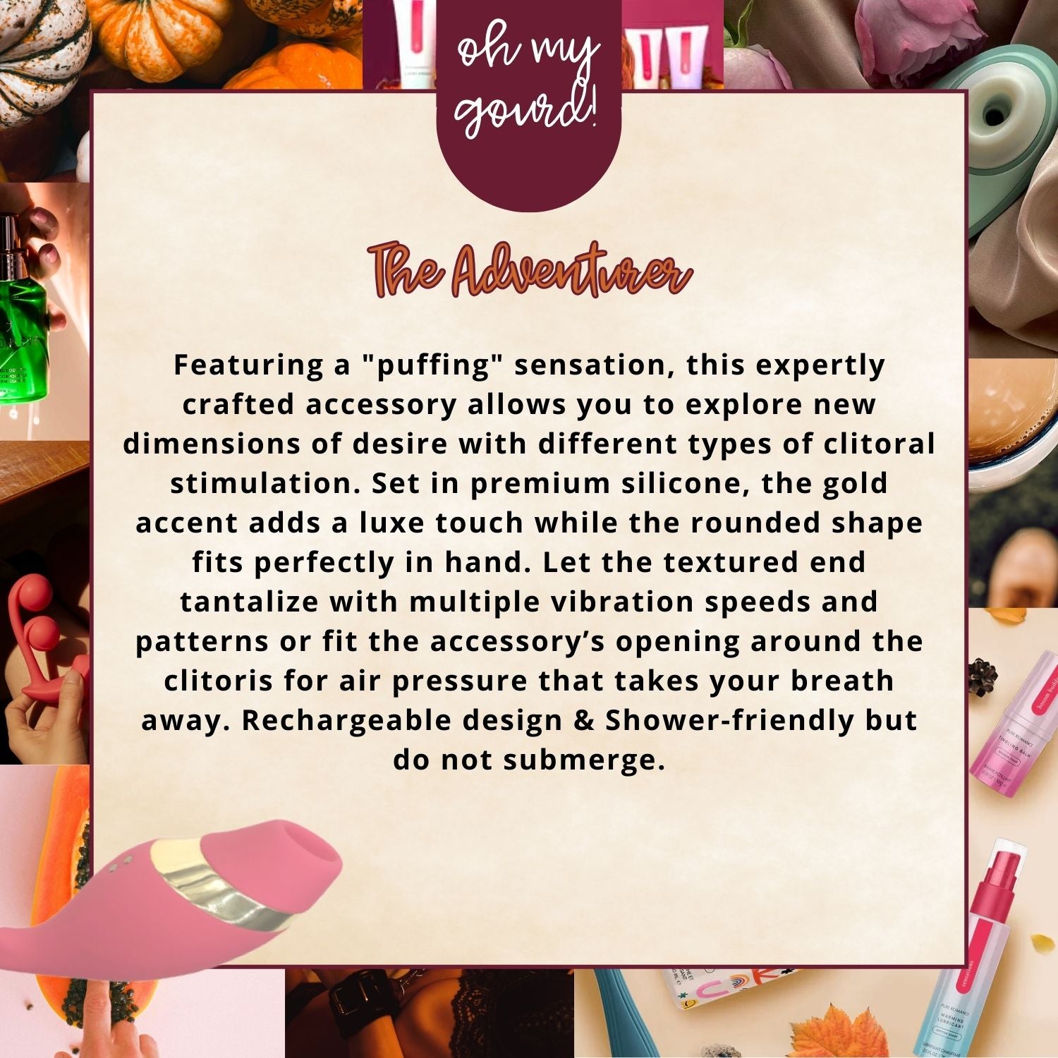 Meet your match with The Adventurer, an exclusive invitation to pleasure. This expertly crafted accessory allows you to explore new dimensions of desire with different types of clitoral stimulation. Set in premium silicone, the gold accent adds a luxe touch while the rounded shape fits perfectly in hand. Let the textured end tantalize with multiple vibration speeds and patterns or fit the accessory's opening around the clitoris for air pressure that takes your breath away.