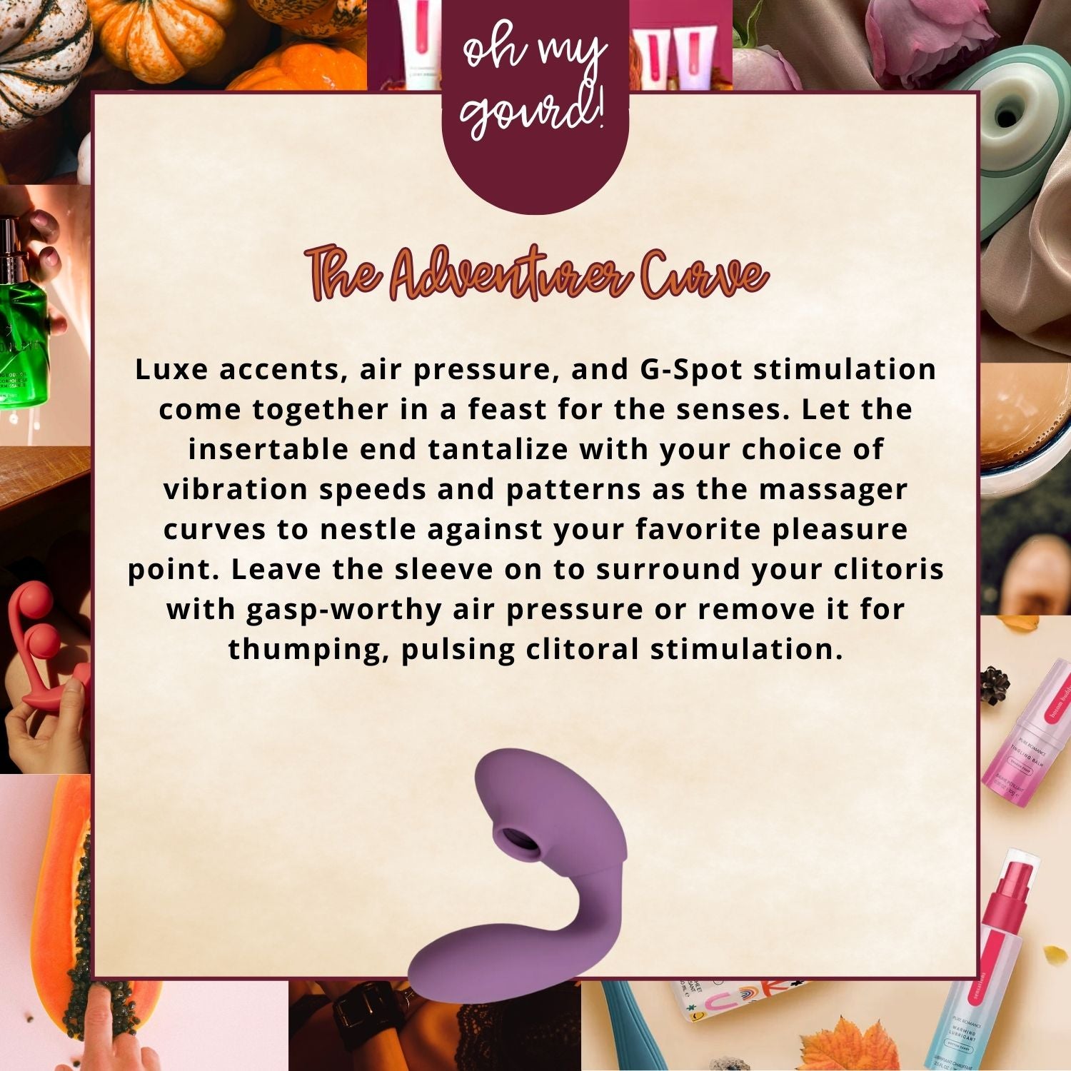 Luxe accents, air pressure, and G-spot stimulation come together in a feast for the senses. Let the insertable end tantalize with your choice of vibration speeds and patterns as the massager curves to nestle against your favorite pleasure point. Leave the sleeve on to surround your clitoris with gasp-worthy air pressure or remove it for thumping, pulsing clitoral stimulation. Which will you love more?