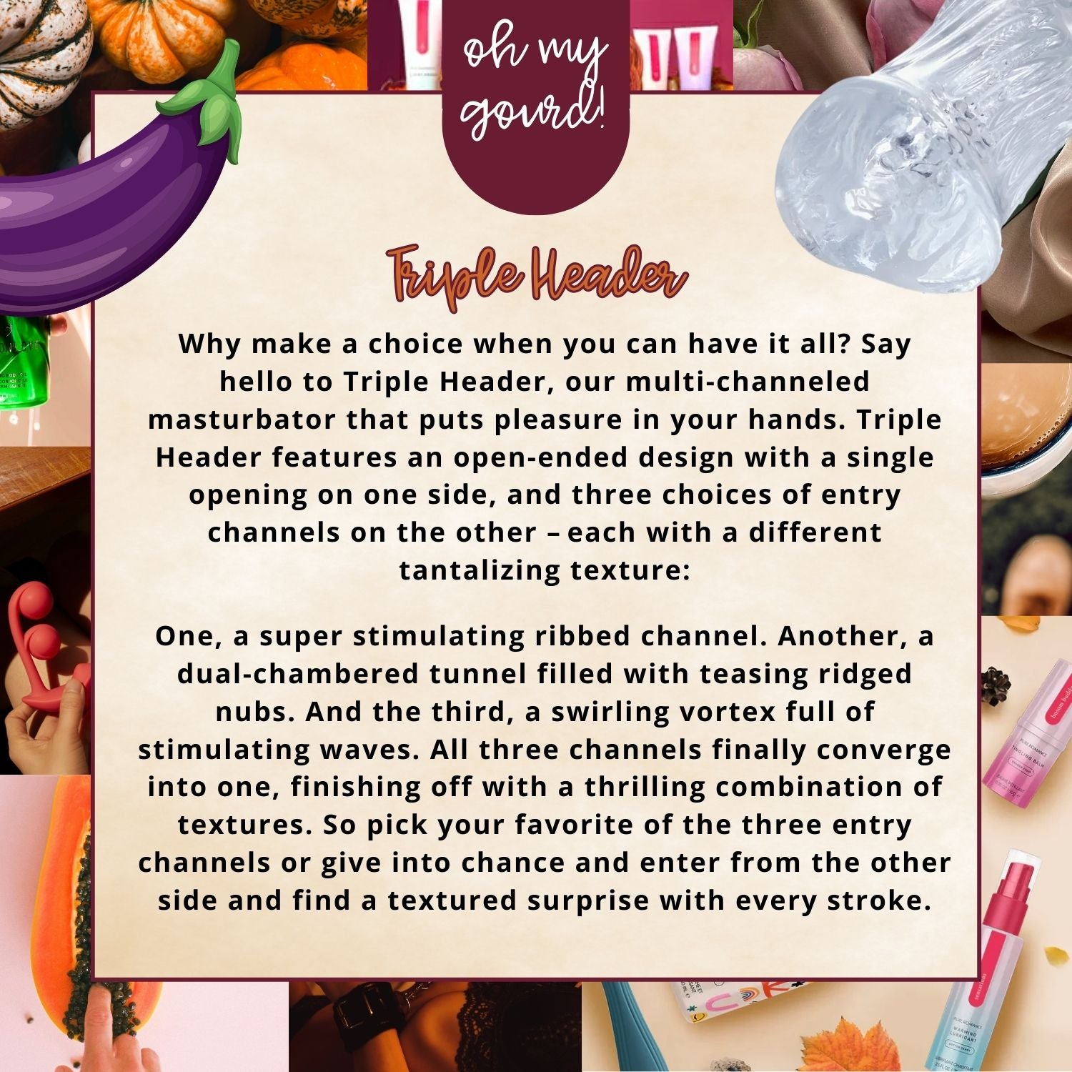 Why make a choice when you can have it all? Say hello to Trifecta, our multi-channeled masturbator that puts pleasure in your hands. Trifecta features an open-ended design with a single opening on one side, and three choices of entry channels on the other – each with a different tantalizing texture.