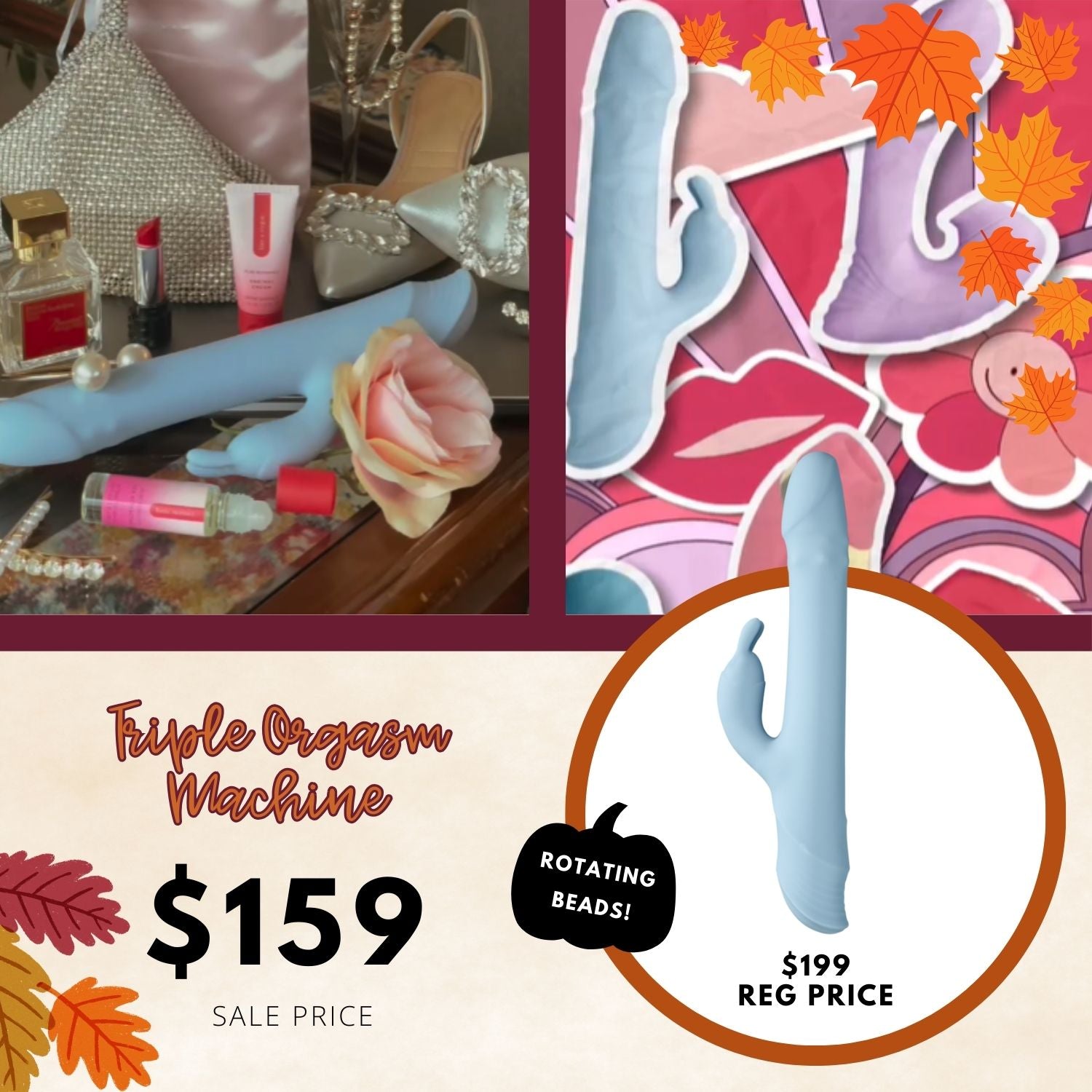 When it comes to powerful, mind-blowing pleasure, more is always more! Discover passion (times three!) with Triple Orgasm Machine, a 3-in-1 vibrator that redefines ecstasy with 3 speeds of thrusting, spinning shaft action and 7 speeds and pulsing patterns of clitoral vibration. As the shaft thrusts, the spinning beads inside tantalize your vaginal walls while the clitoral massager's rabbit ears tease your clitoris with feel-so-good vibrations.