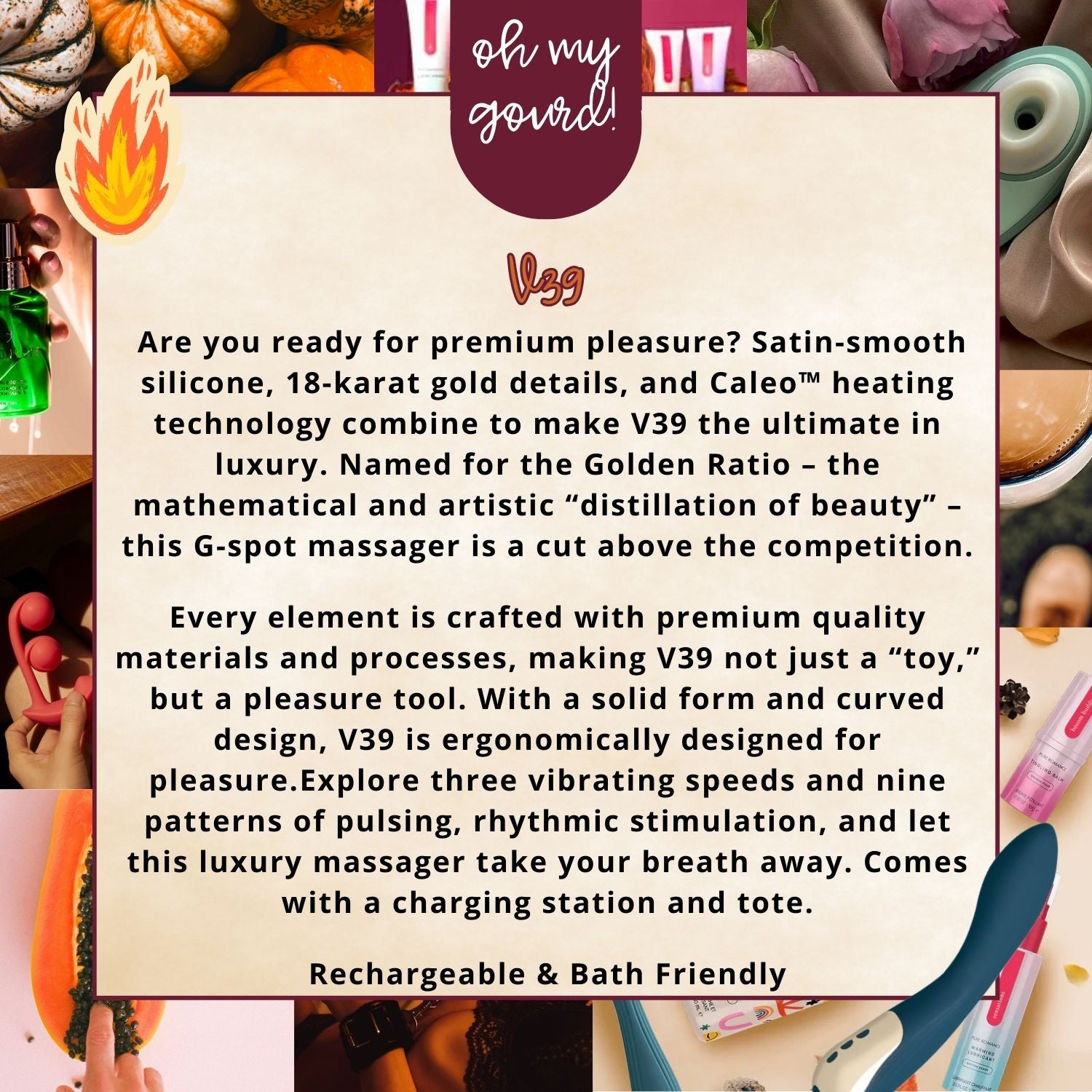 Satin-smooth silicone, 18-karat gold details, and Caleo™ heating technology combine to make V39 the ultimate in luxury. Named for the Golden Ratio – the mathematical and artistic “distillation of beauty” – this G-spot massager is a cut above the competition. Every element is crafted with premium quality materials and processes, making V39 not just a “toy,” but a pleasure tool.