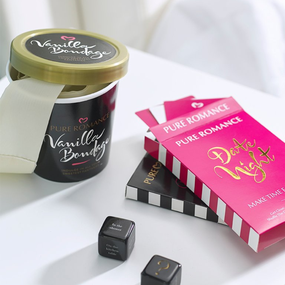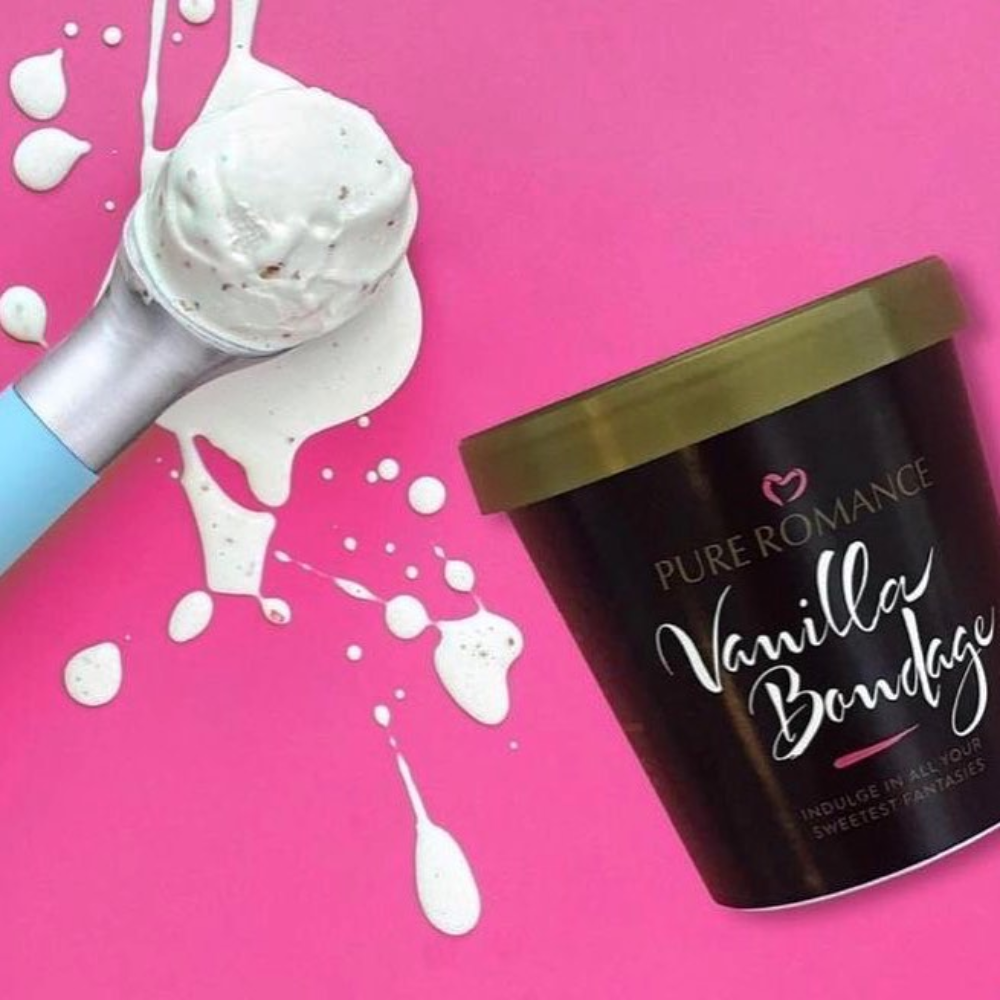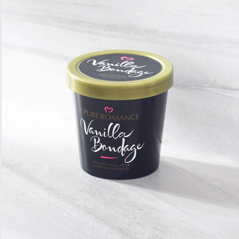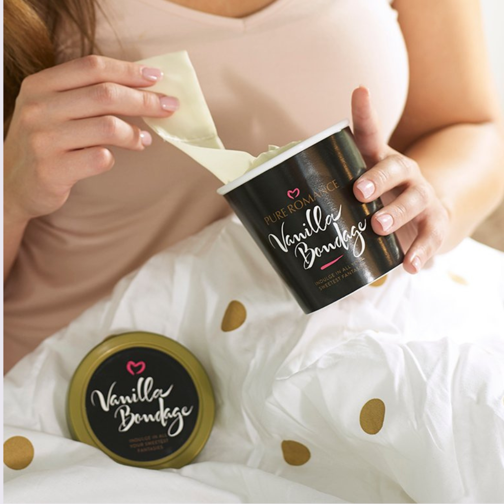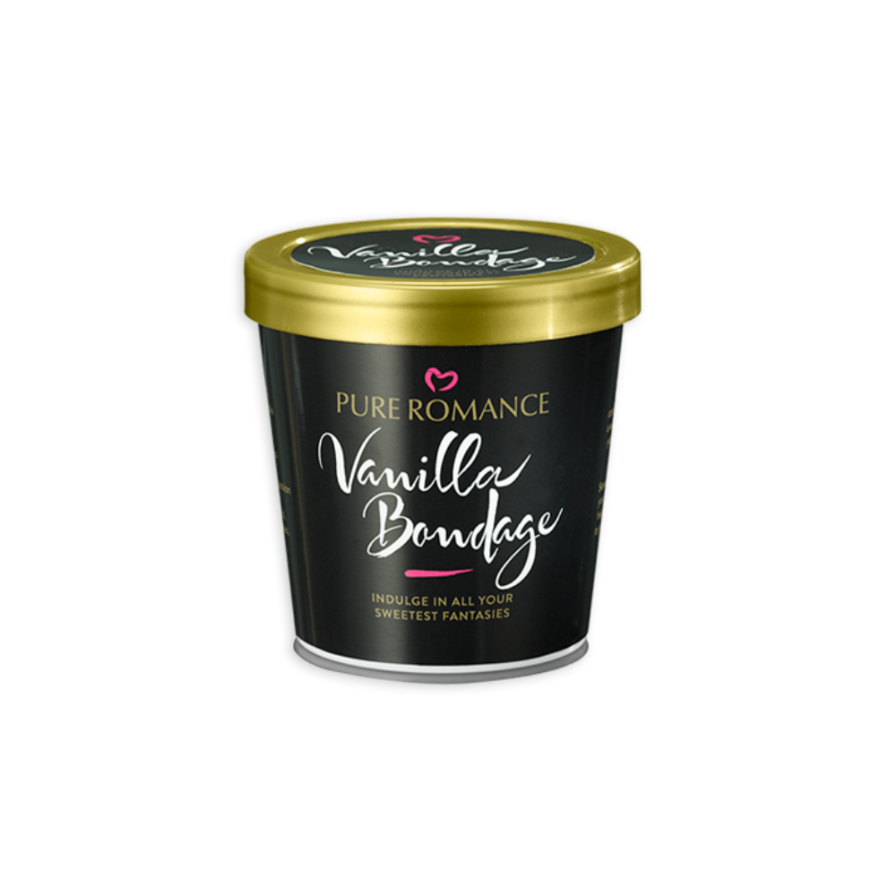 Everyone loves a little vanilla! The Vanilla Bondage Kit makes it easy to bring fantasies to life. Includes soft, silky, cream colored restraints and a vanilla scented blindfold. The bondage kit stores neatly in its own container, which looks like a sexy container of Vanilla ice cream.