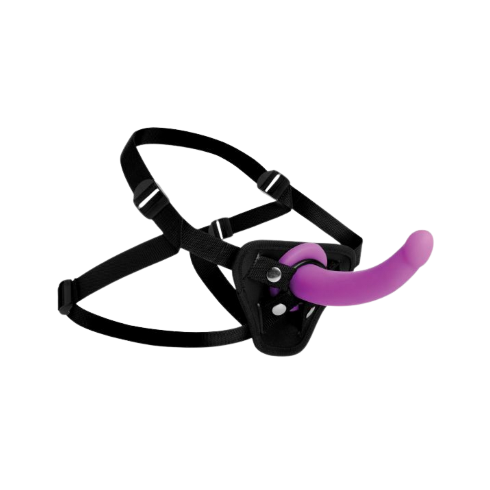 Perfect for pegging or vaginal sex, this strap-on set has everything you need for a comfortable and passionate penetration! Equipped with a sexy, adjustable harness and a silky, non-threatening dildo, you and your partner will be able to delve into new pleasure territory. The harness accommodates many sizes, wrapping seductively around the butt and thighs. A small pocket sits within the inner panel for adding a vibrating bullet if you choose. The dildo is curved for prostate or G-spot stimulation, with a tapered shaft that gradually increases in diameter. This, coupled with the smooth material, will allow for an easy insertion at your own pace.